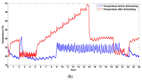 As with the LED light, the operation of the AC unit was based on the room occupancy, as well as the room temperature. Figure 19 shows the power consumptions without and with the use of the HEM system and the corresponding temperature variations. It should be noted that, before the scheduling, the use do not turn off the AC unit even during unoccupied period due to hot climate in UAE. However, the user usually control the AC unit only by just adjusting thermostat set points manually. This is clearly seen in the power consumption pattern and temperature plot represented in the blue line in Figure 19.