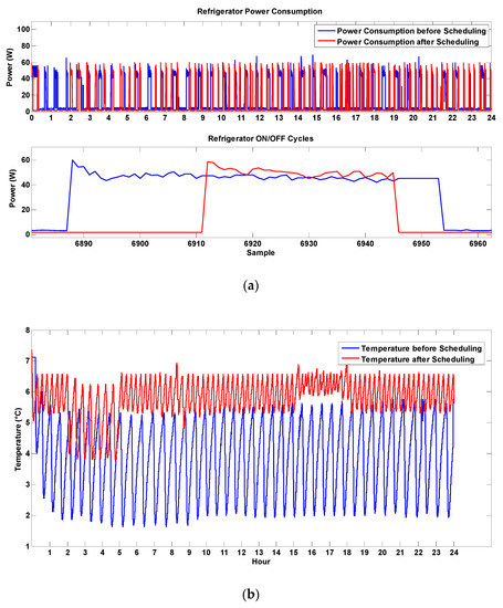 Unlike the two previous home appliances, the use of the refrigerator does not depend on the room occupancy status. Rather, the scheduling of the refrigerator was based on the internal and surrounding temperatures. Figure 21 shows the effect of the HEM system use on the power consumption of the refrigerator and the internal temperature variation of the refrigerator.