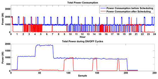 Figure 25 shows the total power consumption trends for all of the appliances without and with the use of the proposed HEM system.