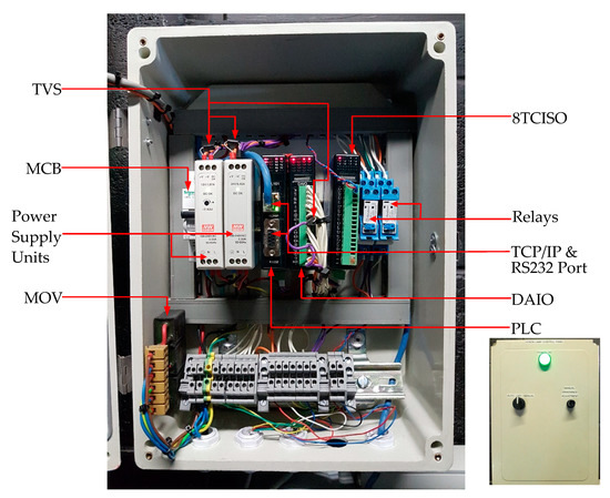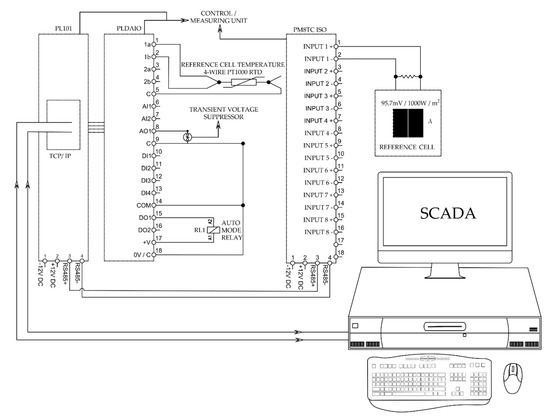 The programmable logic control unit (PLC), the digital/analogue input and output module (DAIO), and a PM8TCISO thermocouple input module with eight inputs, which are fully isolated, were used in this design, and offer input and output solutions [20]. The DAIO module is connected to the PLC through a bus. This high-speed communication bus allows the PLC to communicate with the DAIO module. The PLC, besides being able to communicate with the DAIO, also provides power to the input/output (I/O) module. The bus is connected to the Ethernet port of the CPU module as well as an RS232 port on the module. Connecting the PLC to a personal computer can be achieved through the Ethernet or RS232 port on the module. The PM8TCISO module allows the irradiance from the reference cell to be read, through its calibrated sensitivity of 95.7 mV at 1000 Wm−2. The thermocouple input module permits us to read between 0 and 100 mV linear input signal. Furthermore, the 4-wire PT1000 RTD on the reference cell connected to ports 1a, 1b and c, as shown in Figure 1 and Figure 5, reads the irradiance and temperature on the reference cell.
