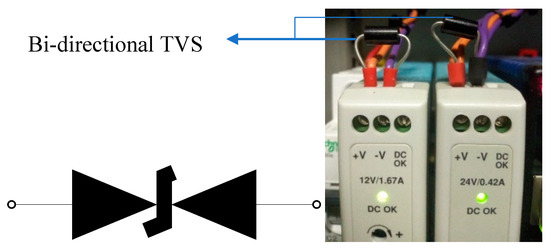 Transient voltages impose stress on electronic equipment, which can cause permanent damage if the breakdown voltage of the component is exceeded [15]. Since transient voltage suppressors (TVSs) are capable of handling electrical over-stress, as seen in [16,17], bi-directional TVSs from ST Microelectronics were used to protect the PLC from transient voltage when starting the solar simulator. The XBO 5000 W/H OFR Xenon lamp light source in the solar simulator requires about 36 kV from the ignitor to ignite the xenon gas in the lamp. The 1.5KE24CA and 1.5KE30CA TVSs, selected from the datasheet provided by the manufacturer, were used on the 12 V and 24 V DC power supplies, is shown in Figure 2.