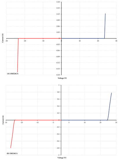 I–V characteristic curve for (A) 1.5KE24CA and (B) 1.5KE30CA Zener diode.