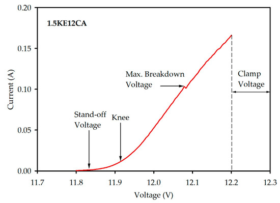 The TVS ratings selected for both power supplies were slightly above the stand-off voltage [18]. This is to prevent the TVSs from clamping [19] at the nominal voltage of the power supplies. A close look at the various points of the 1.5KE12CA TVS, used for demonstration purposes in the forward bias, is shown in Figure 4.