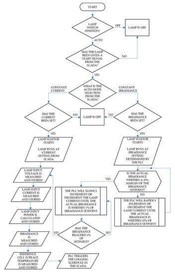 To operate the solar simulator at any desired irradiance set point, such set points must be made on the SCADA. The ADAS starts the solar simulator, and achieves and maintains the desired set point supplied by the SCADA, which triggers the logging of the irradiance, cell surface temperature, solar simulator input current and voltage and lamp power. The autonomous dynamic adaptability algorithm, which describes how the PLC achieves and maintains the set point, is presented in Figure 6.