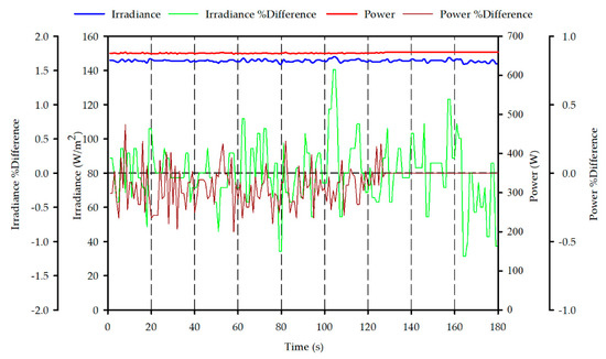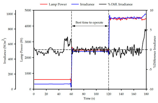 The irradiance of the solar simulator at startup, and the corresponding lamp power, is shown in Figure 4. The lamp power over 180 s shows some stability, when compared to the irradiance over the same time frame. The PLC tries to maintain and keep the irradiance of the solar simulator constant, although slight fluctuations in irradiance can be noticed in Figure 7. The gradual ramping down and up of the solar simulator’s input power, as the PLC tries to keep it constant, has a direct impact on the irradiance of the solar simulator. It can be seen in Figure 7 that the lamp power became stable after 120 s of starting the solar simulator. Although there was a slight fluctuation in the irradiance value after 120 s, it ramped up almost immediately thereafter, and remained relatively stable. This could have been a result of the slight change in the lamp’s input power. The effect of the small fluctuations in the lamp’s input power is seen in the percentage difference of the irradiance from the set point in Figure 4, which is less than ±1%.