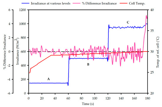 To find out what input current would give 1000 Wm−2, the solar simulator was run at 20%, 50% and 90%, respectively. Running the solar simulator at 50% gave an irradiance value of over 500 Wm−2, as shown in Figure 5. The solar simulator was run for over 70 s. The irradiance remained relatively stable at 500 Wm−2 range. The solar simulator was then operated at 90% of its rated current. The resulting irradiance value was 1000 Wm−2, as shown in Figure 9, Figure 11 and Figure 12, as obtained by [26].