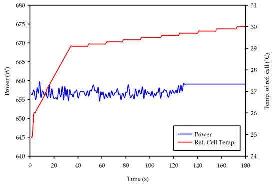The reference cell’s surface temperature over 120 s is shown in Figure 9, Figure 10 and Figure 11. According to [5], it takes pulsed solar simulators approximately 120 ms to carry out a test on PV cells. It took the reference cell between 35 s and 40 s to exceed 25 °C without temperature control. This was ample time to carry out the test on the PV cells after they had been mounted on the target area, as suggested by [5] for steady-state solar simulators. However, the total heat required to maintain 25 °C in the reference cell, while carrying out a test on the PV module, was determined as 1660 Joules.