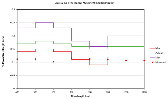 A class AAB (spectral match, spatial uniformity, and temporal instability) obtained at the end of the classification process for the xenon arc lamp solar simulator is seen in Table 1. The results show that a class A spectral match, a class A spatial uniformity, and a temporal instability belonging to class B was obtained over a target area of 1.1 m × 129.5 m. A comparison with a standard solar simulator’s spectral match, obtained from [24], is shown in Figure 13.