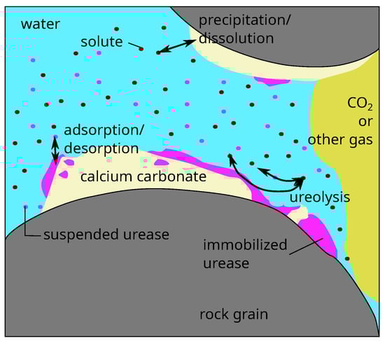For the sake of completeness, we explain the model’s full capability. However, in this study, the terms related to two-phase effects and temperature-induced precipitation have no relevance for the given experimental conditions. Our EICP model concept accounts for two-phase, multicomponent, non-isothermal reactive transport on the scale of a representative elementary volume (REV) where flow is modeled using Darcy’s Law. It includes pH-dependent dissociation reactions, temperature-dependent urease inactivation, as well as temperature-dependent enzymatically catalyzed ureolysis. Mass transfer may occur between both fluid phases by mutual dissolution of water and CO2 in the gas or the aqueous phases or between the aqueous phase and the two “solid” phases adsorbed urease (au) and calcium carbonate (c) by adsorption or desorption of urease and precipitation or dissolution of calcium carbonate. We assume all calcium carbonate precipitates as calcite, as in []. The components considered mobile are denoted by superscripts : water (w), dissolved inorganic carbon (), sodium (Na), chloride (Cl), calcium (Ca), urea (u), ammonium and ammonia (), and suspended urease (su). While our model employs an REV-scale and thus a volume-averaged approach, a pore-scale representation of the relevant processes and phases is shown in Figure 1.