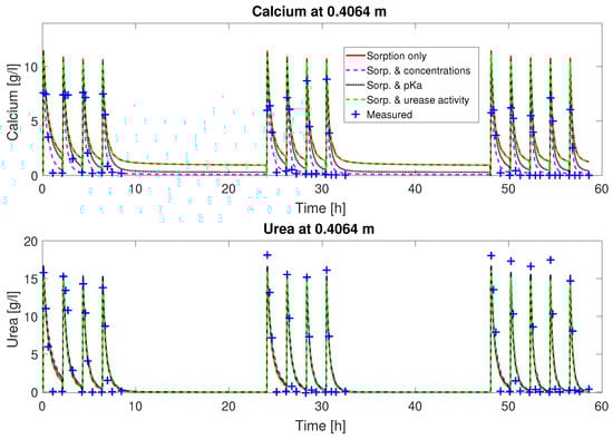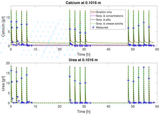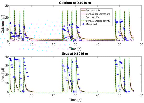 The initial parameter value guesses and the set upper and lower bounds are given in Table A3 in the Appendix A. When using the injection concentrations as additional fitting parameters, the adsorption rate coefficient is estimated as , an increase of 11.7% compared to the sorption-coefficients-only case. The desorption rate coefficient is estimated to be half an order of magnitude larger than for the base case, . The injection concentrations are estimated as g/L and g/L, which is, for calcium, only 80% of the prepared 0.33 M mineralization medium and, for urea, 101.5% of the nominal concentration of the 0.33 M injection solution (g/L, g/L). The reduction in the estimated calcium concentration is approximately the residual calcium concentration predicted in the model in the case where only the ad- and desorption rate coefficients were fitted; see Figure 2 and Figure 3.