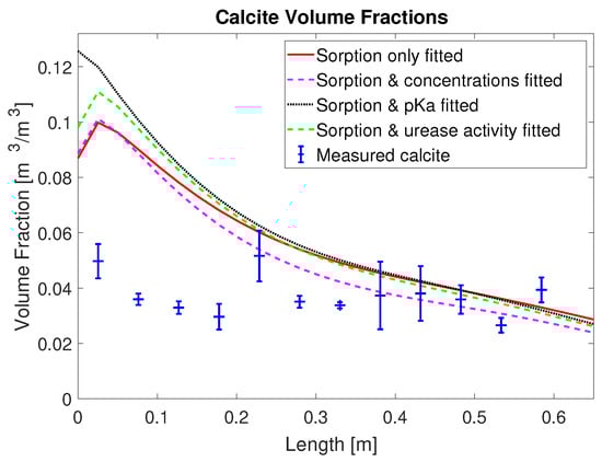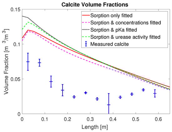 Predicted volume fractions of final calcite for the model calibration attempts compared to the experimental data for column experiment #1 (0.33 M mineralization medium concentration) for the four parameter sets fitted: The error bars represent the standard deviation calculated from triplicate measurements. Note that the calcite volume fraction was not used for calibration.