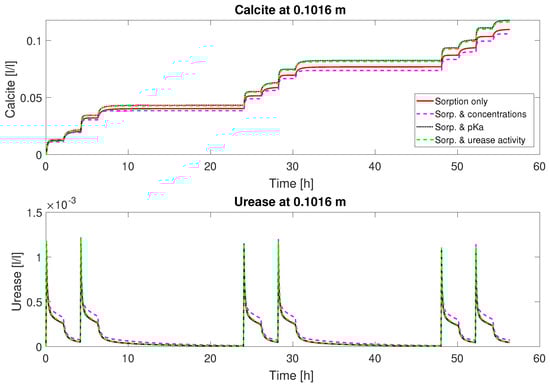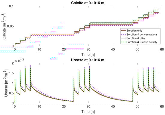 In general, similar trends can be seen when using the four parameter sets, as calibrated to the concentration measurements of column #1 (0.33 M), to predict the concentrations of urea and calcium over time and the final distribution of precipitated calcite for the second column experiment (0.66 M); see Figure 5 and Figure 6. All fitted parameters were the same as in the simulations for column #1, except for the parameter set including the injected concentrations of the mineralization medium, for which the fitted values for column #1 (0.33 M) were doubled. This was done assuming that whatever process might have been responsible for the change in concentrations acted proportionally to the concentrations and that the prepared solutions were of double the concentration for column #2 (0.66 M). None of the data of column #2 (0.66 M) were previously used during the calibration. The most important observation is that all parameter sets can qualitatively predict the measurements, even for the changed concentrations and injection strategy, and that the four parameter sets do not result in drastically different predictions. For all parameter sets and every sub-data set, the residuals for column #2 (0.66 M) are much larger, approximately one order of magnitude compared to those of column #1 (0.33 M); see Table 3. The increased residuals are expected, as the data were not used for calibration. The injected urea and calcium concentrations were doubled for column #2 (0.66 M), increasing the range of concentrations and thus the potential discrepancies between model predictions and measurements. This doubling of the injection concentrations might be responsible for an increase in the residuals be a factor of four when assuming a linear scaling of the difference between measured and predicted concentrations; see Equation (29). In addition, urease was added only before every odd-numbered mineralization-medium injection for column #2 (0.66 M), which may have contributed to the increased residuals. As a consequence, the model-predicted ureolysis and precipitation reactions behave differently for the odd- and the even-numbered injections, which is not for all injections the case in the experiment (Figure 6). For all calibration parameters sets, the model predicts reduced ureolytic activity and, thus, precipitation very regularly and evenly for all even-numbered mineralization-medium injections. The experimental measurements however do not show a similarly consistent, repetitive decrease of the ureolytic activity for even-numbered mineralization-medium injections. Thus, during some injection cycles, the model underpredicts ureolysis and precipitation, while in general overestimates both, leading to an overestimation of the final volume fraction of precipitated calcite (Figure 5). Interestingly, the sum of the concentration residuals for column #2 (0.66 M) is lowest for the sorption-coefficients-only case and increases for all other parameter sets in which additional parameters were calibrated. The residuals for the final calcite of column #2 (0.66 M) behave very similarly to those of column #1 (0.33 M), as they are lowest for the parameter set including the ad- and desorption rate coefficients and the injection concentrations and the second lowest for the parameter set including only the ad- and desorption rate coefficients.