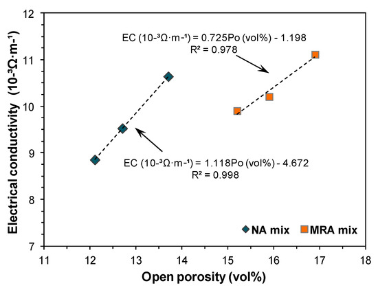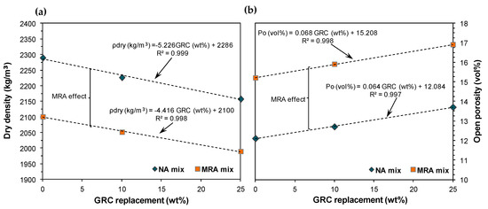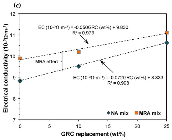 - The decline in dry density and the rise in electrical conductivity were associated with the incorporation of GRC in mixes with 100% NA as well as those with 50% MRA due to the higher porosity in the recycled materials;
