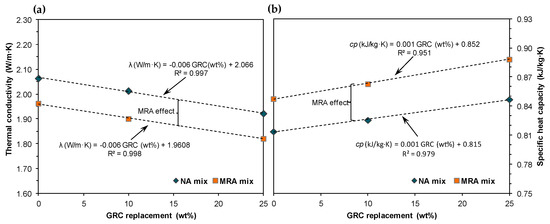 - The use of 25% GRC in conjunction with 50% MRA reduced thermal conductivity by 11.8% and raised specific heat capacity by 9.1%, whilst the values for 25% GRC with 100% NA were a 6.9% reduction in thermal conductivity and a 4.1% rise in specific heat capacity, both relative to concrete with 100% natural aggregate (NA);