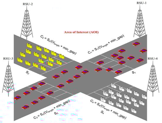 Vehicular mobility is an essential factor that influences the structure of vehicles’ dynamics. Despite the high speed and randomness of the vehicles’ speed, road topology, speed limits, traffic rules, and nearby vehicle speed restrict the vehicle movement. To design a feasible traffic congestion detection scheme, it is essential to consider the relationship between speed and inter-vehicle spacing [40]. In this paper, we used the essential mobility factors for traffic jam detection and prevention. In the given scenario (as shown in Figure 2), four junction points are highly susceptible to the massive traffic jam. Thus, to avoid unwanted enormous traffic jam, it is necessary to predict real-time congestion on each vulnerable junction point. For this purpose, it is assumed that each arrival point has an RSU located significantly away (i.e., 1 km) from the AOI so that to detect early congestion. The installed RSU acts as a traffic controller and aims to monitor the specified road segment for real-time congestion detection. Considering the basic transportation rules [41] and basic microscopic parameters [20], we derived two parameters for congestion detection, i.e., (1) road segment occupancy rate and (2) single-vehicle occupancy time. The definition of the occupancy rate is given in the above section. However, occupancy time can be defined as below: