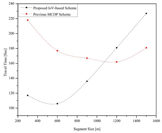 Effect of various segment sizes on IoV-based CDA travel time (previous MCDP scheme [20]).
