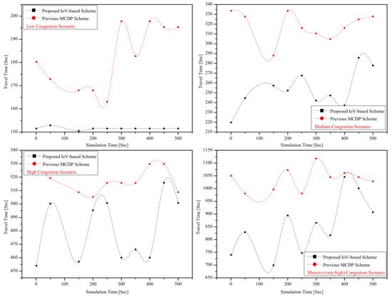 The path cost is directly proportional to the congestion levels. By increasing the congestion level, the path cost also increases, as shown in Figure 7. It is also depicted that the proposed IoV-based CDA significantly outperforms than the previous MCDP [20] scheme in all congestion levels. The path cost substantially increases in the massively congested scenario in both schemes. In the highly congested scenario, the large number of vehicles increase the occupancy level of the road’s segment significantly, which subsequently affects the path cost. The assessment of the second performance metric, i.e., travel time is also shown in Figure 8. In a low congested scenario, most of the vehicles use the direct short-route instead of the alternate best route, that is why the occupancy level of the direct route increases, which further affect the travel time.