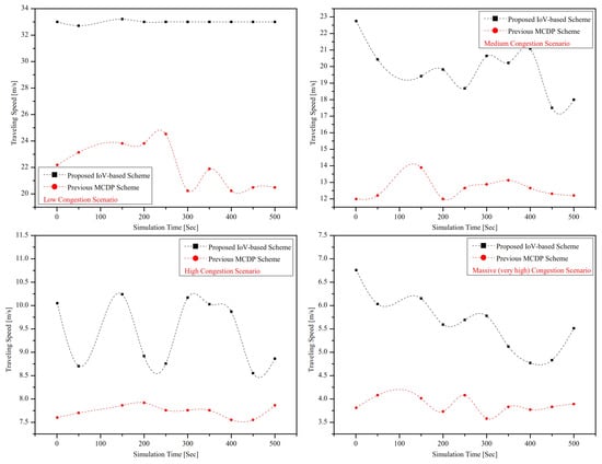 Lastly, this section discusses the assessment of the travelling speed metric over the performance of the IoV-based CDA and MCDP [20] scheme. In Figure 9, the variation of travelling speed in both schemes (IoV-based CDA and MCDP [20]) is shown. The path cost has the same impact on travelling speed like travel time.