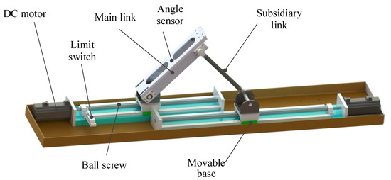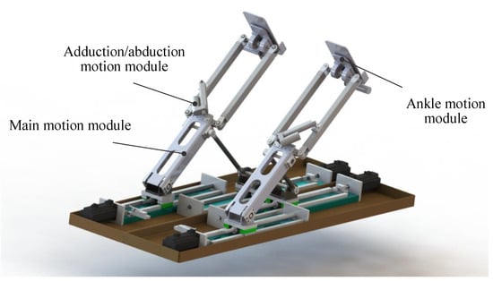 The adduction/abduction motion module is a parallelogram mechanism, as shown in Figure 3a, which is fixed on the main motion module. The A/A movement of the hip is conducted by the motion of the parallelogram mechanism; the parallelogram mechanism is driven by a linear actuator assembled on the main motion module (Figure 6b). The linear actuator is in the minimum length while the parallelogram mechanism is collinear to the main motion module; the maximum angle between the parallelogram mechanism and the main motion module is 40° while the linear actuator is in the maximum length.