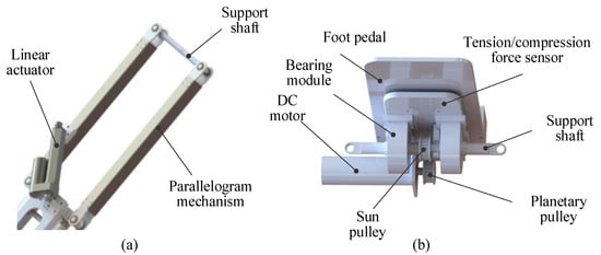 The structure of the ankle motion module is similar to a planetary gear train, and the ankle motion module could rotate around the support shaft of the parallelogram mechanism. The timing belt and pulley system is shown in Figure 3b, and it mainly consists of a sun pulley fixed on the support shaft, a planetary pulley and a timing belt working as an inner ring gear. The planetary pulley is driven by a DC motor fixed under the foot pedal. The tension/compression force sensor is assembled under the pedal; bearing modules fixed to the sensor are assembled on the support shaft. The measuring range of the force sensor is ±5 kg. The angle displacement range of the pedal is from −60° to 60°, and it is limited by a machine key fixed on the support shaft.