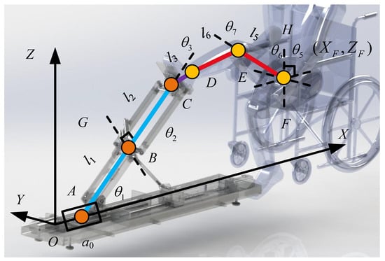 The human-robot hybrid linkage coordinate system is built as shown in Figure 5; the global coordinate system is located on the far end of the main ball screw while the plane is parallel to the sagittal plane. The linkage chain is divided into the linkage ABC and the linkage FED (right leg), and the forward/inverse kinematics of two parts are solved through the Denavit-Hartenberg (D-H) method in the global coordinate system .