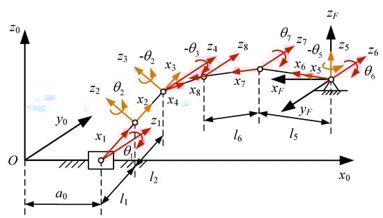 Similarly, the transformation of the linkage FED could be calculated using the D-H parameters in Table 3. To analyze the linkage ABC and the linkage FED in one coordinate system, a coordinate transformation matrix between with is built. The forward/inverse kinematics of the linkage FED is expressed as follows:
