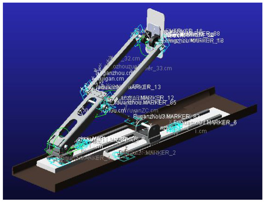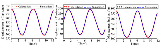 To verify the kinematic equation solving, a verification based on the simulation model is conducted in the software Automatic Dynamic Analysis of Mechanical Systems (ADAMS) as shown in Figure 7. The main steps include inputting the model, adding constraints and setting the drive equations. The joint initial positions are , and the initial position of the end effector is (1019.7, 167.6, 777). The drive equations are given as follows.