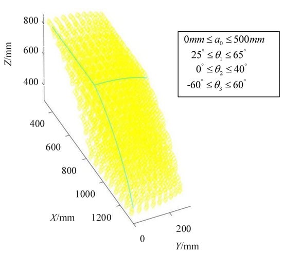 Before planning the training trajectory, the workspace of the robot needs to be determined. The workspace refers to the spatial point set of the end effector, which represents the activity scope of the robots. As a virtual link (l3) is assumed between the robot and the human in the kinematic analysis of Section 3, the human ankle joint (point D) is regarded as the mechanism end point in the workspace analysis. The workspace is analyzed with the numerical method, and the robot workspace is a hexahedron as shown in Figure 9. Substituting the extreme value of each joint into the forward kinematic, and workspace boundaries of the robot could be determined.