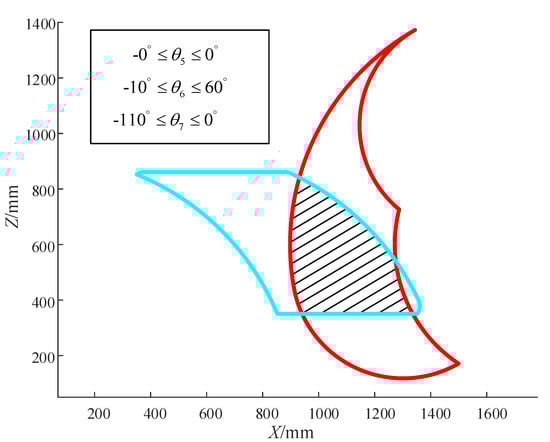 The variable human-robot workspace is the overlapping part of two spaces, and it is changed depending on different parameters of the human limb. Figure 10 shows a situation of the sagittal training, and the variable human-robot workspace is the shadow part. The hip joint positions (XF and ZF) are set as 1790 mm and 600 mm. The lengths of the human thigh (l5) and crus (l6) are 396 mm and 496 mm.