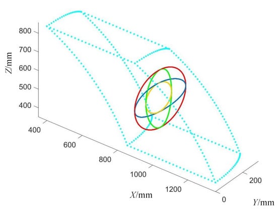 The spherical ellipse training trajectory is used for the hip circumduction rehabilitation, and it is planned depending on the patient’s joint ROM through the second method. To guarantee the training effect of the hip joint, the patient’s leg is left straight in the circumduction training. The rotation center could be calculated from the simplified Equation (4) by inputting the joint angle ( and ) ranges of the hip joint, and the trajectory of the human ankle could be built as follows: