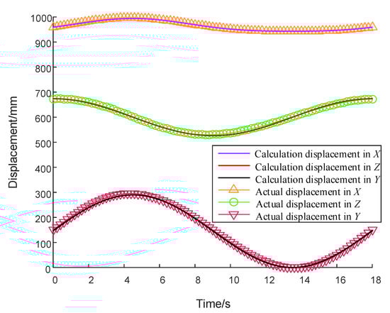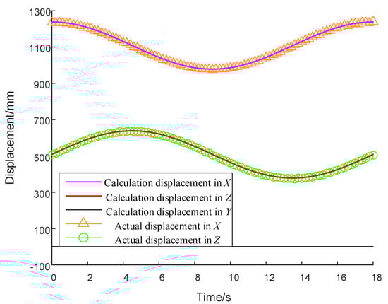 The circle trajectory was modified based on the maximum incircle of the S1, S2 and S3 boundary arcs, which could be described through Equations (14) and (15). The circle center position was (1108.3, 0, 508.7), and the radius was 130 mm. The angular velocity was set as 0.11π rad/s. The end point position theoretical calculation and the human joint angle theoretical calculation are shown in Figure 14 and Figure 15. The actual positions of the end point could be obtained through angle sensors and encoders, and the actual angles of the human joints were detected by sensors tied to the subject’s leg. Experimental results are also shown in Figure 14 and Figure 15. The end point maximum displacement errors between the calculation and the experiment were 5.46 mm and 4.84 mm in the X- and Z-axes, and the human joint angle maximum displacement errors between the calculation and the experiment were 1.45° and 1.99° in and .