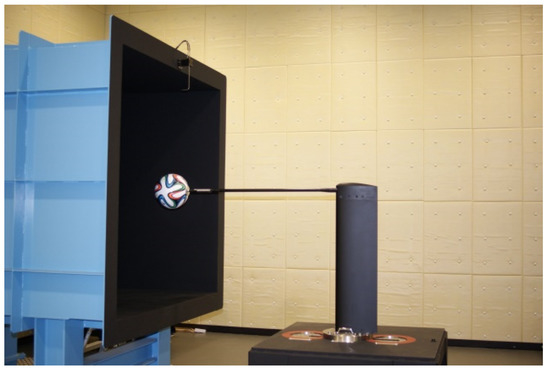 A low-speed circulating wind tunnel with a six-component balance (maximum wind velocity = 55 m/s; measuring section = 1.5 m × 1.5 m; turbulence level = 0.1%) was employed (Figure 2) to verify the drag force coefficient of the nonspinning ball using CFD. The tests were conducted on a thermally bonded soccer ball with six panels (Brazuca (size 5), Adidas; officially approved for use in international games). The ball was supported at the rear using a sting (fixture) fitted to the six-component wind tunnel balance. The ball was fixed to the sting using an adhesive such that it could not rotate. The ball panel orientation in the wind tunnel experiment was the same as that in the CFD analysis. The flow speeds used in the wind tunnel experiment were in the range of 7–35 m/s (Re = 1.06 × 105 to 5.31 × 105) for the nonspinning ball [19].
