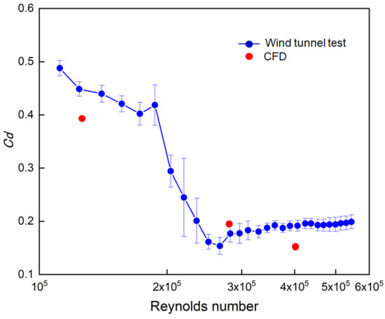Comparison of the drag force coefficients of a nonspinning ball determined from CFD analyses and wind tunnel tests (the error bars indicate the standard deviation of Cd).