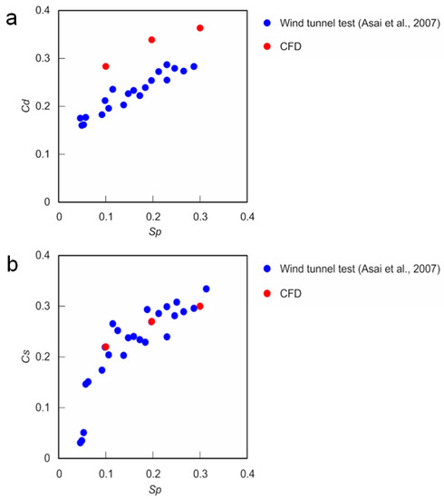 The average Cd of the nonspinning ball obtained from CFD in this study is similar to that obtained from wind tunnel tests in the present study as well as in previous studies [19,20] and, hence, it is reasonable to conclude that the CFD calculations are valid. Further, the average Cs of the spinning ball obtained from CFD is slightly larger than the value obtained in wind tunnel tests in this study, but the trends are similar in that the average Cs increases with an increase in Sp. Some reports [34,37] have claimed that the average Cs of the spinning ball increases as Re increases, and considering that the average Cs depends on the ball speed, these calculations may be deemed to be within the permissible range. Thus, the CFD results for the nonspinning and spinning balls in this study are in broad agreement with the results of wind tunnel tests and can be considered reliable.