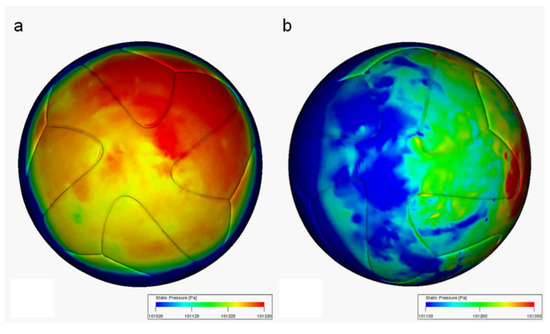 Example of static pressure observed on (a) nonspinning and (b) spinning soccer balls using CFD (back view). The spin direction of the spinning soccer ball in (b) is anticlockwise from the top view.