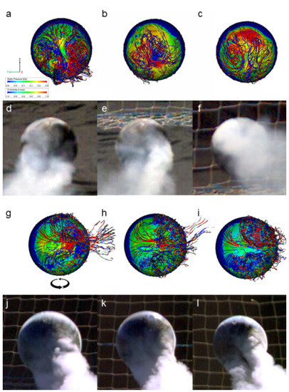 In the case of a spinning ball, the CFD results (Spin B; ω = 50.2 rad/s, Re = 4.25 × 105) indicated a large-scale counter-rotating vortex pair in the wake downstream of the rotating direction (right side of the back view in Figure 8), but the vortex pair remained relatively stable and exhibited only minor fluctuations (Figure 8g–i). Similar trends were observed in the other cases involving a spinning ball. In the free-flight test, a large-scale counter-rotating vortex pair, similar to that observed in the CFD analysis, was formed in the wake of the spinning ball (ω = 37.7 rad/s, Re = 3.94 × 105) on the downstream side of the rotating direction (counterclockwise when viewed from the top). Again, this vortex pair structure was relatively stable and had relatively minor fluctuations (Figure 8j–l).