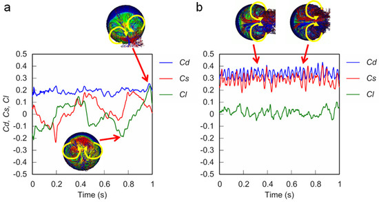 The unsteady Cs and Cl of a nonspinning ball in the case of Nonspin B obtained using CFD (Re = 2.80 × 105) exhibited bigger large-scale fluctuations than unsteady Cd (Figure 9a). The unsteady Cs and Cl in the case of Nonspin B yielded negative and positive values in 1 s. However, Cs, Cl, and Cd for a spinning ball in the case of Spin B (Sp = 0.2 (8 rps) and Re = 4.1 × 105 (28 m/s)) exhibited small large-scale fluctuations (Figure 9b). In particular, the large-scale fluctuation of the unsteady Cs for a spinning ball was smaller than that for a nonspinning ball. Moreover, the unsteady Cs in the case of Spin B yielded only positive values in 1 s. The unsteady Cs of the nonspinning and spinning balls in the other cases exhibited the same trends.