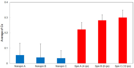 Comparison of the average side force coefficients (Cs) of nonspinning and spinning soccer balls (p < 0.01). The Re values in the case of Nonspin A, Nonspin B, and Nonspin C are 1.25 × 105, 2.80 × 105, and 4.00 × 105, respectively, and the Re values in the case of Spin A, Spin B, and Spin C are 4.25 × 105 (spin rate = 4, 8, and 12 rps, respectively).