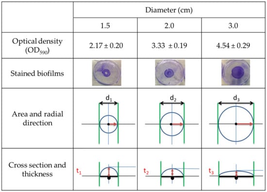Biofilms were grown within circular areas (on polystyrene) with diameters of 1.5, 2.0 and 3.0 cm, and then their biomass was quantified. Figure 1 displays different values/pictures/images of the biofilms as a function of the diameter (1.5, 2.0, 3.0 cm). In the first row, the CV optical density values (OD590) are displayed, which are related to the total biomass. In the second row, the pictures of the biofilms after staining with CV assay are presented. The third row displays the areas, the diameters (d1 < d2 < d3), and the radial directions, indicated by a red rightwards arrow, which starts at the centre of the drop (black round spot, Figure 1) and points towards the border. The fourth row contains the cross-sections of the 400 µL drops: the thickness at the centre (black spot in the centre) of the drop is indicated by the red double-headed arrow (t1 > t2 > t3). The CV optical density values (first row) appear proportional to the diameter of the drop. The larger the diameter, the larger the area was (third row) and, consequently, the area of interactions between the bacterial population and the polystyrene surface. Based on pictures of the biofilms (second row), it can be easily conceived that the samples with diameter 1.5 cm formed a ring shape, due to the strong detachment of the central part of the biofilm during rinsing. Biofilms with diameter 2.0 cm also lost some part of the biofilm in the centre during the rinsing procedure. Biofilms with diameter 3.0 cm, instead, were generally well attached to the surface. Looking at the cross-section and diameter (third and fourth row), it can be logically seen that larger areas (d1 < d2 < d3) result in a shorter height of the liquid column (lower thickness, t1 > t2 > t3). Moreover, the height of the liquid column (thickness of the drop, t) substantially varied between the centre (black spot) and the border (delimited by the green lines) for biofilms with diameters of 1.5 and 2.0 cm, while it smoothly varied for biofilms having 3.0 cm of diameter. As a consequence of the good attachment of biofilms grown with 3 cm of diameter, this latter was chosen to develop the biofilm protocol.