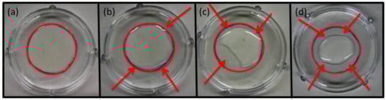 Four different TSB concentrations (1.5, 3.0, 15.0 and 30.0 g/L) were tested to understand whether the cell growth within the biofilm was promoted by a more diluted broth, as suggested by the literature [8,9,44,48]. Although all the prepared suspensions contained the same level of inoculum density (107 CFU/mL), the change in the TSB concentration determined a consequent variation in the surface tension, as can be observed in Figure 2. This resulted in a “pulling back” phenomenon, which prohibited the spreading of the drop on the defined area as desired. In Figure 2, the red circles pointed out the areas expected to be covered by the suspension, while the arrows highlighted the uncovered polystyrene surfaces. For this reason, the TSB concentration was fixed at 30.0 g/L, allowing the biofilms to grow on the whole area on which the suspension was previously spread.