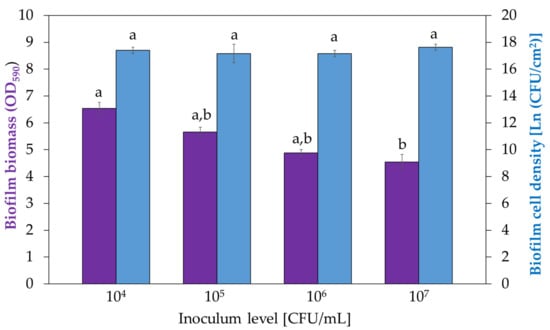 Levels of inoculum density of 104, 105, 106 and 107 CFU/mL were tested. These inoculum levels correspond to 6.34, 8.64, 10.94 and 13.25 ln(CFU/cm2), respectively, on the surface of the petri dishes. The protocols related to the enumeration of the viable cells and the optical density measurements were carried out. The bar chart in Figure 3 (blue bars) displays the natural logarithm of the CFU per area of biofilm (biofilm cell density) obtained with different inoculum levels. The variation of the inoculum levels did not affect the viable cell density within 24-h-grown biofilms. This means that biofilms contained the same number of cells, regardless of the inoculum level after overnight growth. The bar chart in Figure 3 (violet bars) instead shows the optical density values (total biomass) of 24-h-grown biofilms for different inoculum levels. The biomass quantification demonstrated that with a lower inoculum level, a higher total biomass was observed.