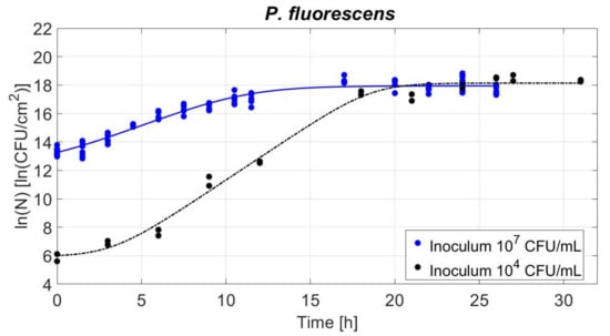 First, the outcomes concerning the growth curves indicated that it can be reasonably assumed that the planktonic cells immediately begin the attachment to and growth on the substratum. The initial populations, ln(No), were proportional to the inoculum concentrations, and these results corroborated that the number of attached bacteria was found to be dependent on these initial cell densities [20,22,55].