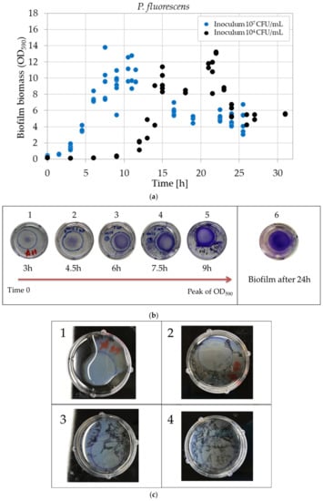 (a) Development of the P. fluorescens biofilm biomass after CV staining. Optical density (OD590) variation in time obtained with 104 (black dots) and 107 (blue dots) CFU/mL inoculum levels. (b) Pictures of stained biofilms during its formation and development: pictures (1), (2), (3), (4) and (5) correspond to 3h, 4h30, 6h, 7h30 and 9h of growth, while (6) corresponds to 24-h-grown biofilm. (c) Pellicles corresponding to the biofilm formed at the air-liquid interface, after adding PBS solution. In picture (1), a whole pellicle covering the entire interface can be observed; from (2) to (4), it is destroyed in gradually smaller fractions, floating at the interface.