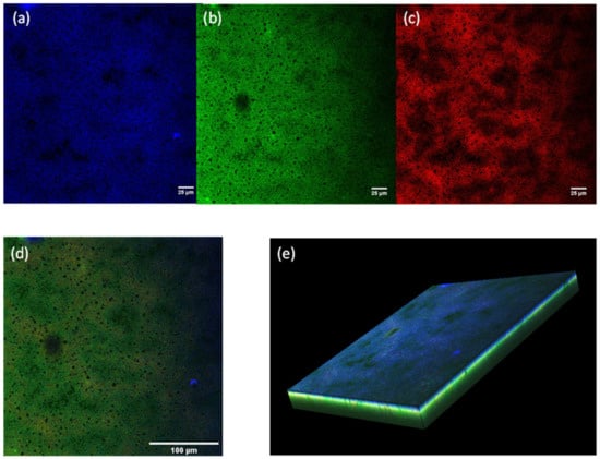 The protocol yielded a fully mature biofilm, as demonstrated by confocal laser scanning microscopy. After fluorescent staining, 24-h-grown biofilms were visualised with CLSM. The estimated biofilm thickness was approximately 73 µm. The three CLSM images (in Figure 6a–c), corresponding to half the depth of the biofilm (approximately 38 µm), show the complex architecture of the biofilms. The blue dye (CFW) makes it possible to visualise the polysaccharides of the EPS, specifically 1-3 or 1-4 β-glycosidic bonds between saccharides [6]. This represents the biofilm matrix. The green dye (SYTO9) is a nucleic acid stain that diffuses through cellular membranes; consequently, it binds to the DNA of both viable and dead cells. In fact, it also stains the extracellular DNA that is part of the EPS. The PI is an intercalating agent that stains the dead cells, penetrating their damaged membrane. The CLSM images served as a way of understanding the 3D structure, and the different components within the biofilm. Figure 4 represents the combination of the three laser channels (CWF, SYTO9 and PI) at the same depth of 38 µm. The structure of the biofilm is displayed in the images (Figure 6a–d), where the black circular spots represent the water channels. They clearly differ in the dimension of the pores and are essential for the transportation of nutrients. Figure 6c displayed larger dark areas, indicating that the dead cells are in lower quantity and are clumped together. Figure 6e displays a 3D reconstruction of the biofilm using z-stack acquisition. As can clearly be seen, the top part of the biofilms was mainly covered by EPS to protect the cells from external factors (blue), while the middle and bottom part, growing in contact with the polystyrene, was mainly composed by densely packed cells (green).