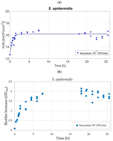 The protocol for biofilm development was validated using another strain with different characteristics from P. fluorescens, such as (i) shape, cocci rather than bacillus, (ii) genus, Staphylococcus, and (iii) Gram-nature, specifically Gram-positive. The biofilm biomass and the population density were measured during the biofilm development and the growth parameters were estimated. The data are shown in Figure 7a,b, for the biofilm biomass and the population density, respectively. Figure 7a shows that S. epidermidis growth showed a sigmoidal curve following the Baranyi and Roberts (1994) model [23]. The growth parameters, estimated by fitting the Baranyi and Roberts (1994) model to the experimental data, corresponded to 13.16 ± 0.43 [ln(CFU/cm2)] for the initial population ln(N0), 2.622 ± 1.35 [1/h] for the maximum specific growth rate (µmax) and 16.36 ± 0.12 [ln(CFU/cm2)] for the maximum cell density ln(Nmax), while the lag time was equal to zero. The RMSE related to the quality of the fit was equal to 0.6115. The biofilm development occurred in the first few hours and the population density reached a plateau that maintained constant until 25h30. The attachment of the bacteria occurs at once when the bacterial population is exposed to the polystyrene surface. Figure 7b showed the S. epidermidis biomass evolution in time. Differently from P. fluorescens, neither the coffee ring effect nor pellicles formation was observed at any time points. For S. epidermidis, the biofilm biomass was uniform on the whole area since the first attachment. The optical density increased and reached a constant value (plateau) after 7h30. Replicates of the biomass and population density (10 and 20, respectively) demonstrate that the S. epidermidis biofilm was highly reproducible as for P. fluorescens. Specifically, OD of 1.78 ± 0.27 and 15.6 ± 0.19 ln(CFU/cm2) were obtained for the biofilm biomass and population density.