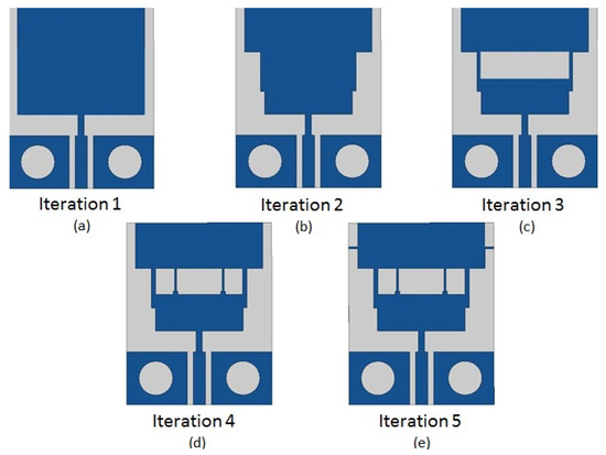 The proposed antenna design was based on the idea, which is presented in [24], using a full ground plane. Figure 1 shows the different stages in the evolution of the proposed monopole antenna. Each of the iterated structures was tested via simulating the return loss for each. The initial structure illustrated in Figure 1a was the basic shape, which consisted of a rectangular patch antenna and two parasitic strips; each one had a circular slot for enhancing the overall antenna performance. Afterward, an additional L-notch was embedded in the patch to introduce the second case, as depicted in Figure 1b. Afterward, a rectangular slot was added in the patch, as shown in Figure 1c, to improve the bandwidth by 2 GHz and the gain by 1.3 dB, as shown in Figure 2 and declared in Table 1, respectively. A novel technique consisting of double T-shaped structures was added in the rectangular slot of the patch with an optimized separation distance between them, as demonstrated in Figure 1d. Finally, the proposed antenna was obtained by adding stubs at the left and right sides, as illustrated in Figure 1e.