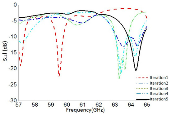 Simulated return loss characteristics of the different iteration of antenna structures with the full ground structure in the bottom plane of the proposed antenna.