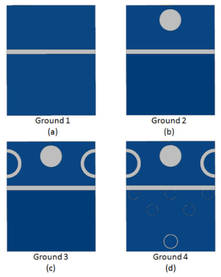 The ground structure was defected by adding a single circular slot at the bottom center, forming ground 2, as shown in Figure 3b. Two rings at the left and right sides of the ground plane were etched to form ground 3, as depicted in Figure 3c.