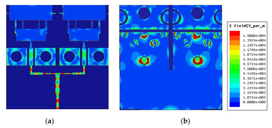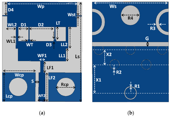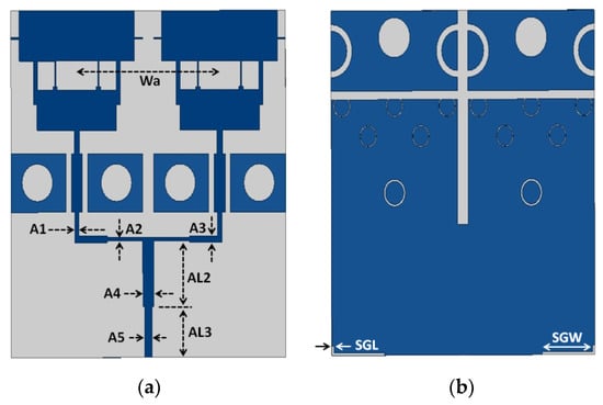 One way to decrease the radiation losses caused by the added discontinuities is the use of a multiport network model. The minimization of losses in the microstrip feed network will yield a microstrip antenna array with higher efficiency. Recently, there has been an increased interest in the use of a defected ground structure (DGS) to improve the performance of the microstrip antennas, which can be achieved by the etching of a simple shape defect in the ground plane of the microstrip antenna. The DGS may be compared to the equivalent circuit consisting of an inductance and a capacitance in parallel [12,13,14,15,16]. The monopole antenna has many advantages, such as small size, low profile, easy manufacturing, and integration, as well as low cost. These advantages make it an ideal choice for the 60 GHz band application [17]; however, the monopoles’ major disadvantages are low gain and small bandwidth.