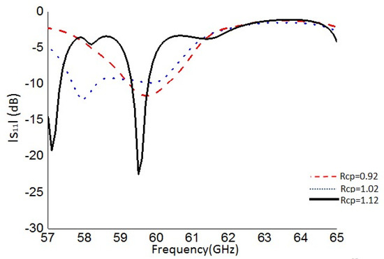 A parametric study was performed to determine the optimum radius for the circular slots (Rcp). The tested radii of these slots were 0.92, 1.02, and 1.12 mm, and the return loss (S11) results obtained for each case are shown in Figure 6. The lowest return loss at the desired frequency was −23 dB and was achieved at Rcp = 1.12 mm, while the other values failed to achieve the desired performance.